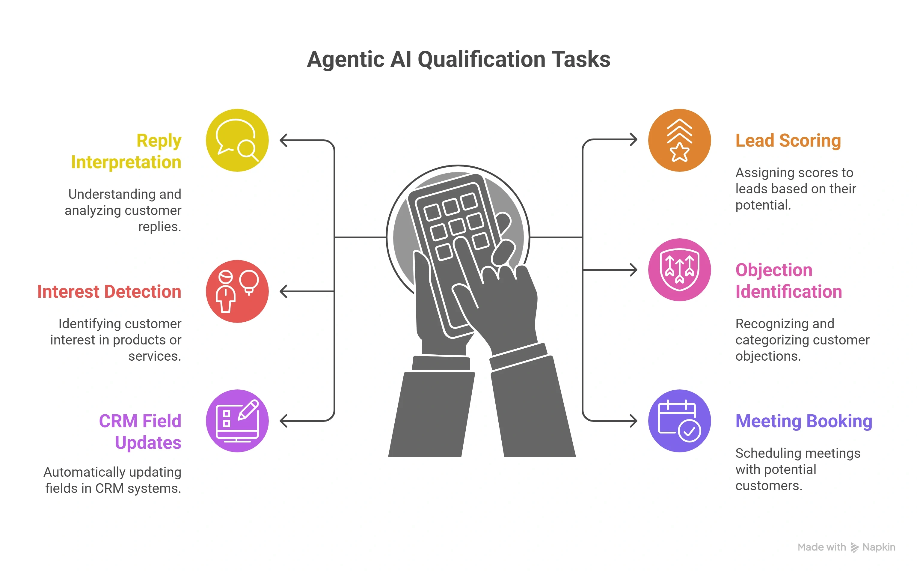 Traditional lead qualification forces SDRs to manually read every reply, score interest, and update the CRM slowing response time and introducing human bias. Agentic AI automates this entire process using autonomous agents that read replies, analyze tone and intent, detect buying signals, and decide next actions instantly.
