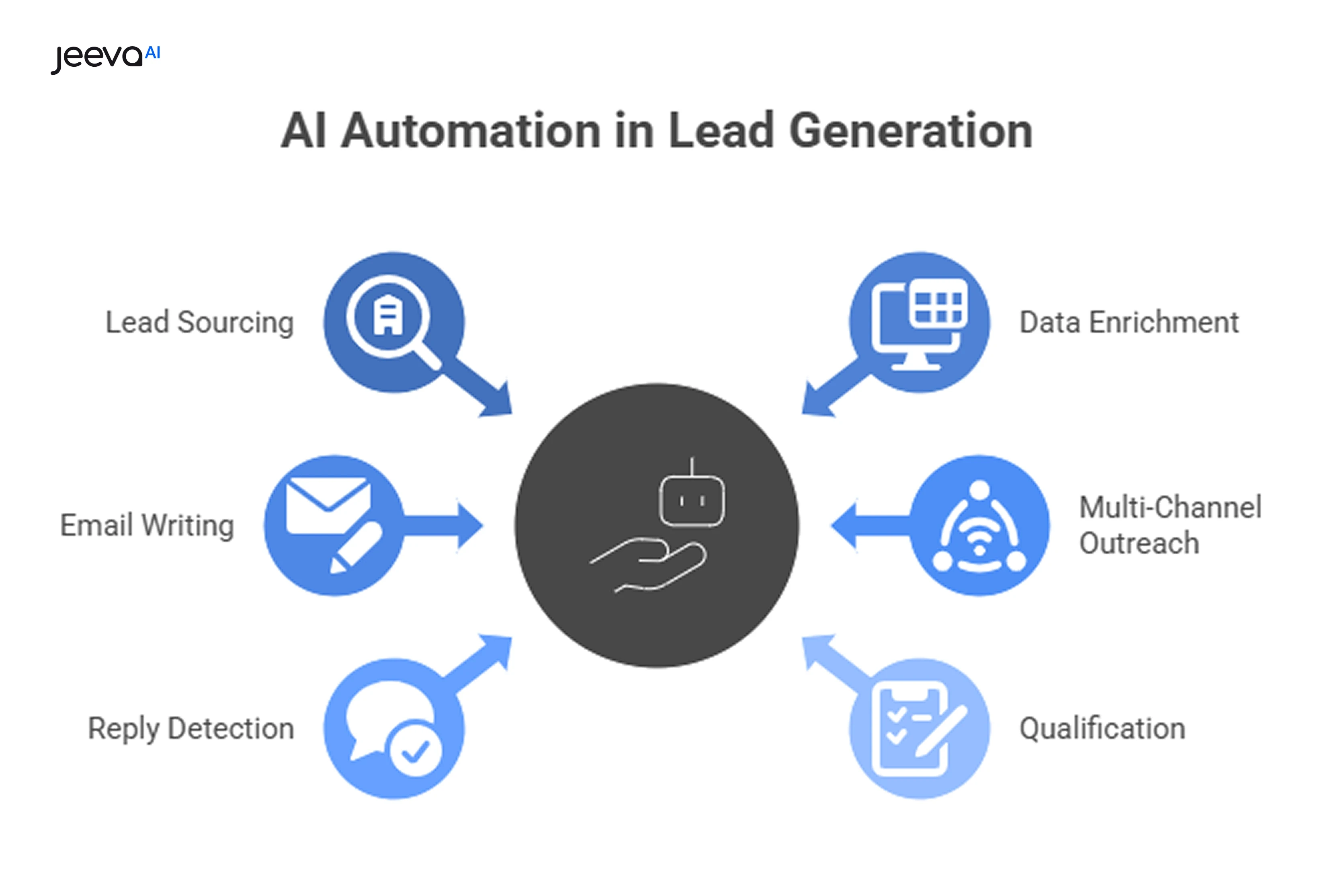 AI automates lead generation by handling the most time-consuming tasks instantly. Instead of manually searching for prospects, enriching data, and writing emails, AI tools do this in minutes.