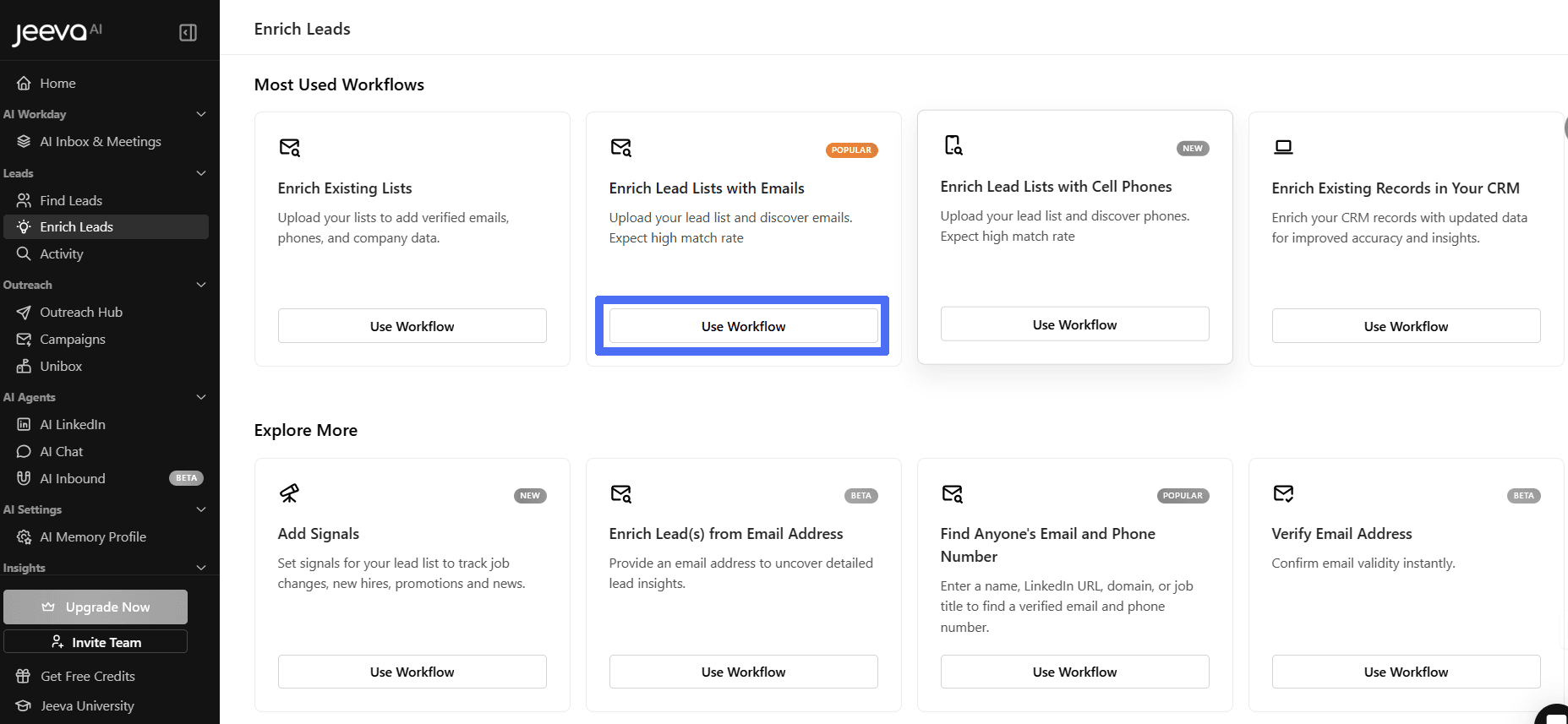 Under Most Used Workflows, locate Enrich Lead Lists with Emails.