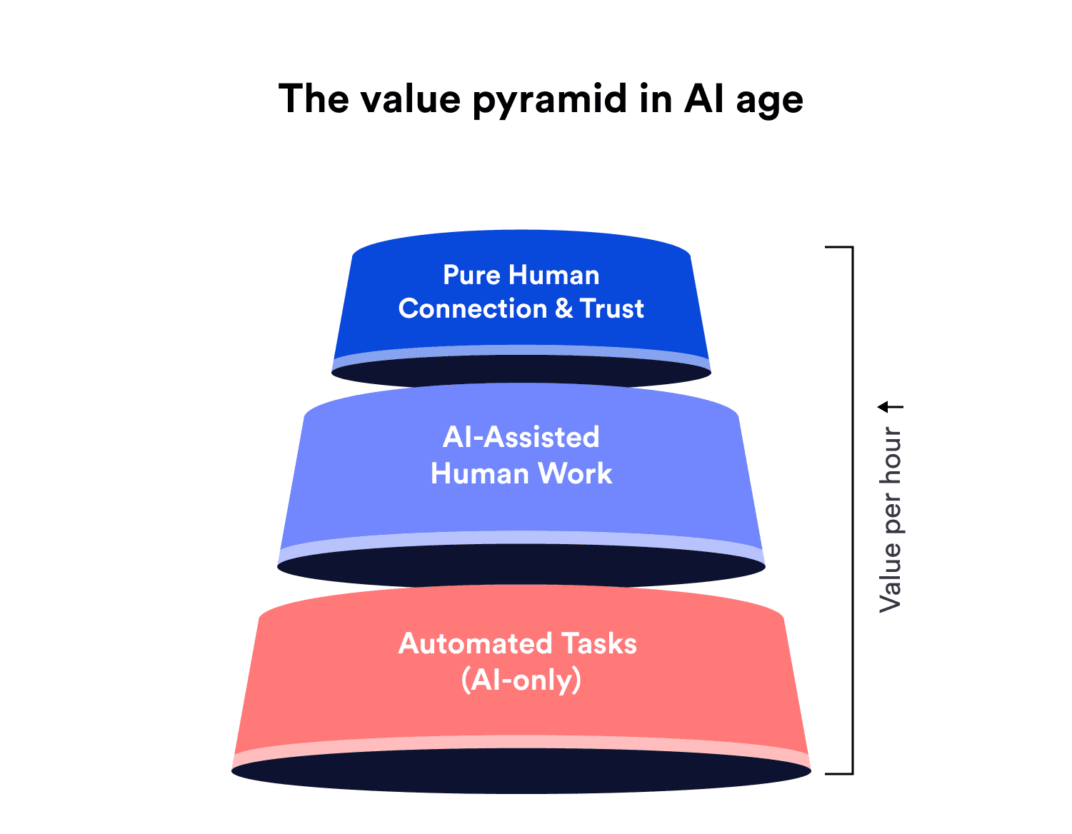 Sales won't remain a high-volume profession - one person with AI assistance can handle what previously required an entire team - but it can remain deeply human. The nature of sales work shifts from repetitive outreach (AI-handled) to relationship management.