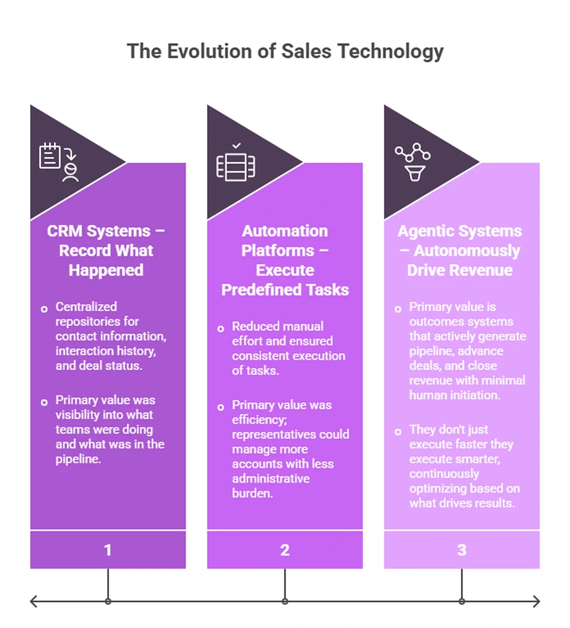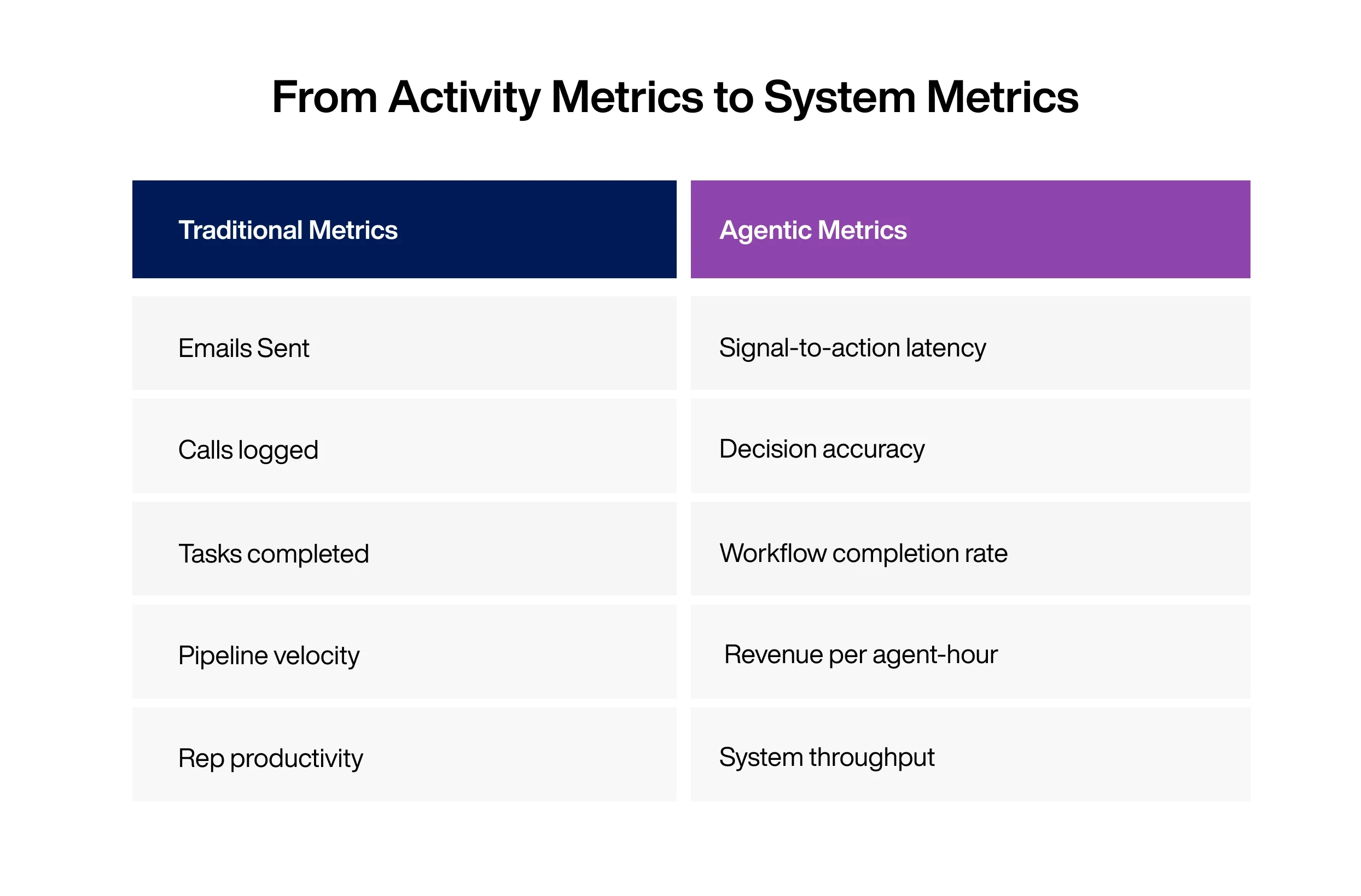 Agentic systems optimize outcomes. They focus on revenue generated, deals closed, and pipeline created. Activities are merely means to those ends, dynamically adjusted based on what's working.