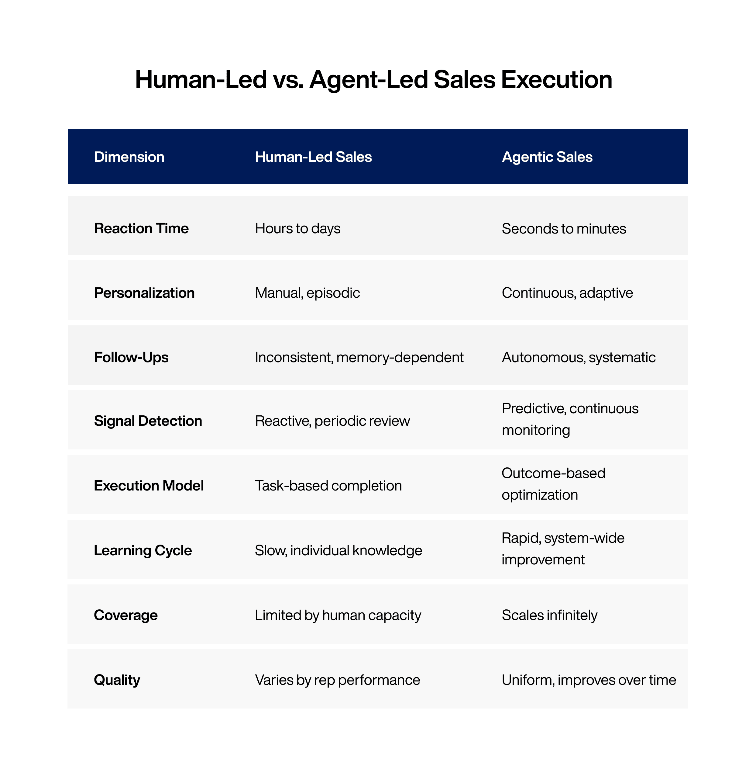 From Rep-Initiated to System-Led: Traditional sales requires human decision-making at every step. Agentic systems independently identify opportunities, determine optimal actions, execute workflows, and only escalate to humans when strategic judgment is required.