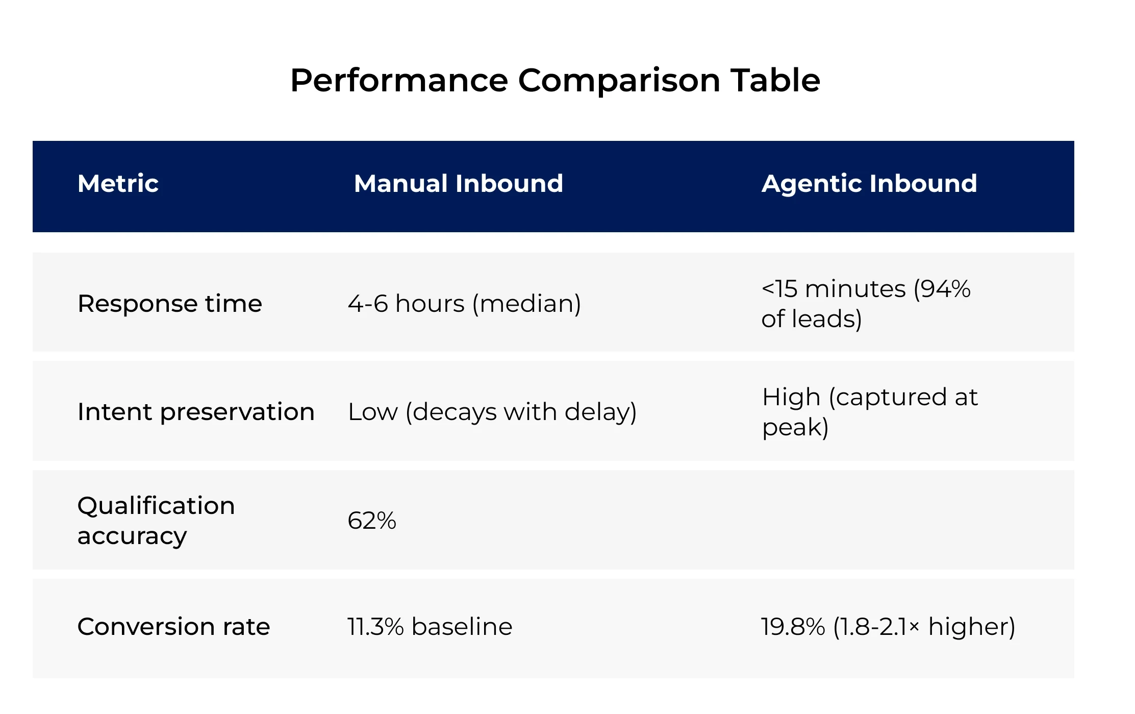 The ultimate measure of inbound effectiveness is conversion rate from lead to qualified opportunity. Manual inbound converts at an average rate of 11.3% in our benchmark dataset. Agentic inbound converts at 19.8% a 75% improvement.