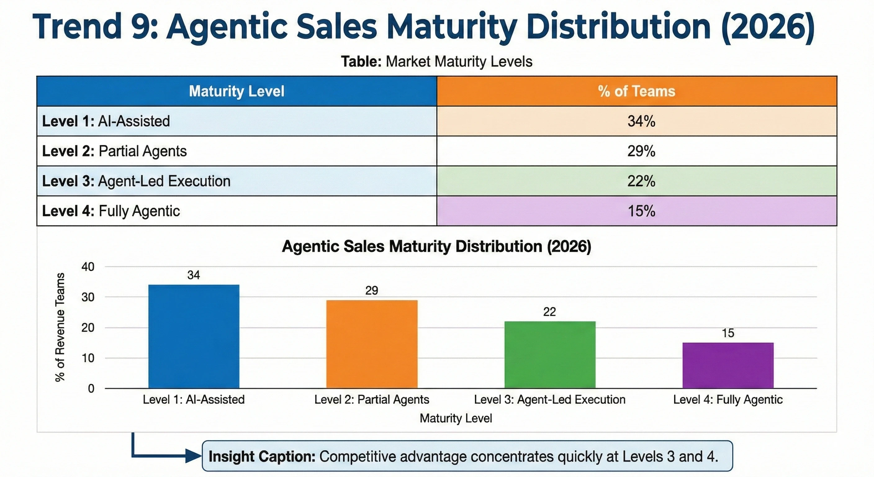 The Agentic Sales Maturity Model provides a simple framework for executives to assess where their organization sits today and what capability gaps must be closed to move forward.