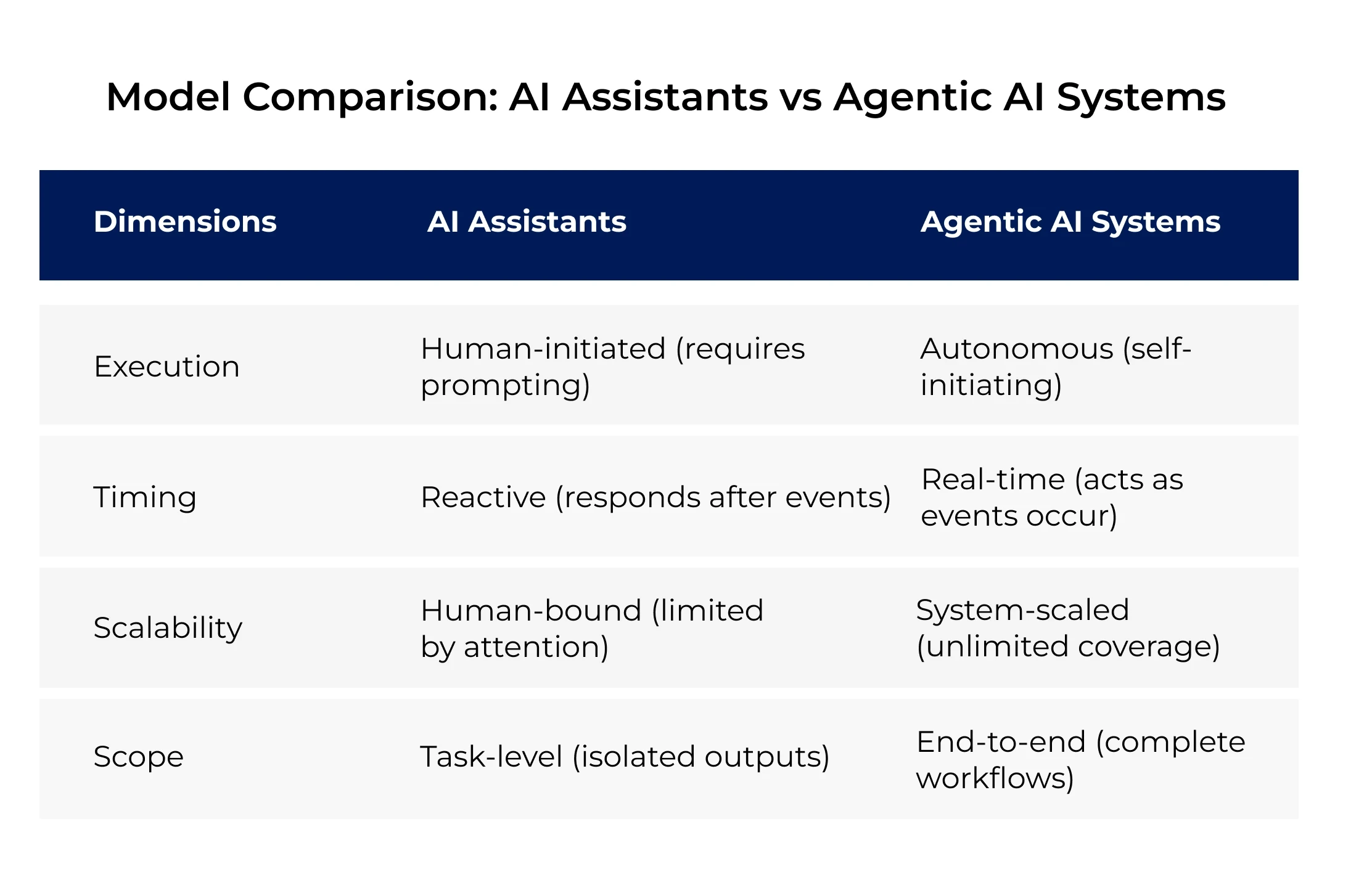Organizations continuing to invest primarily in AI assistance tools are optimizing for incremental efficiency gains within a fundamentally human-constrained operating model. Those building agentic capabilities are redesigning their execution architecture to operate at machine speed and scale.